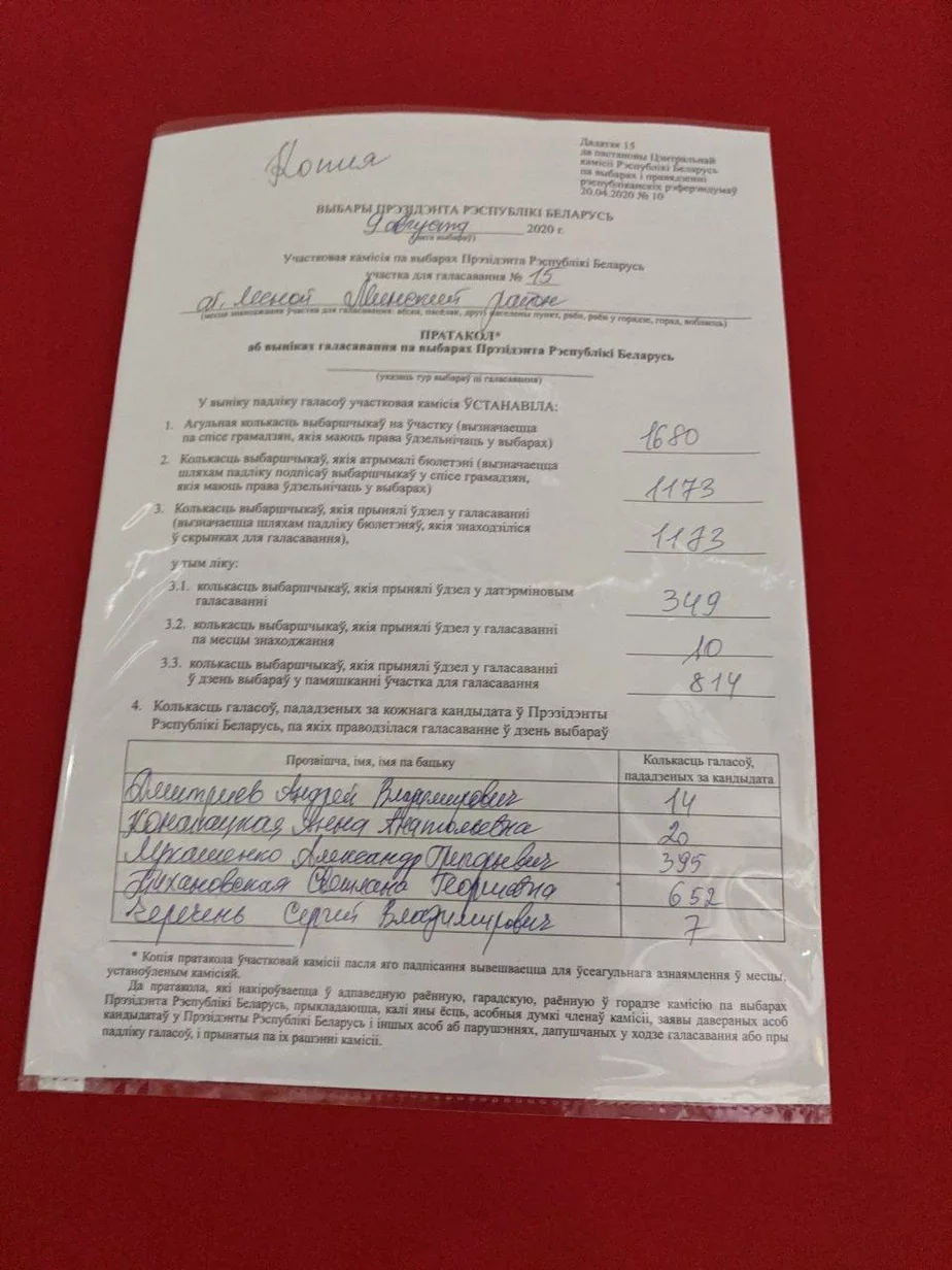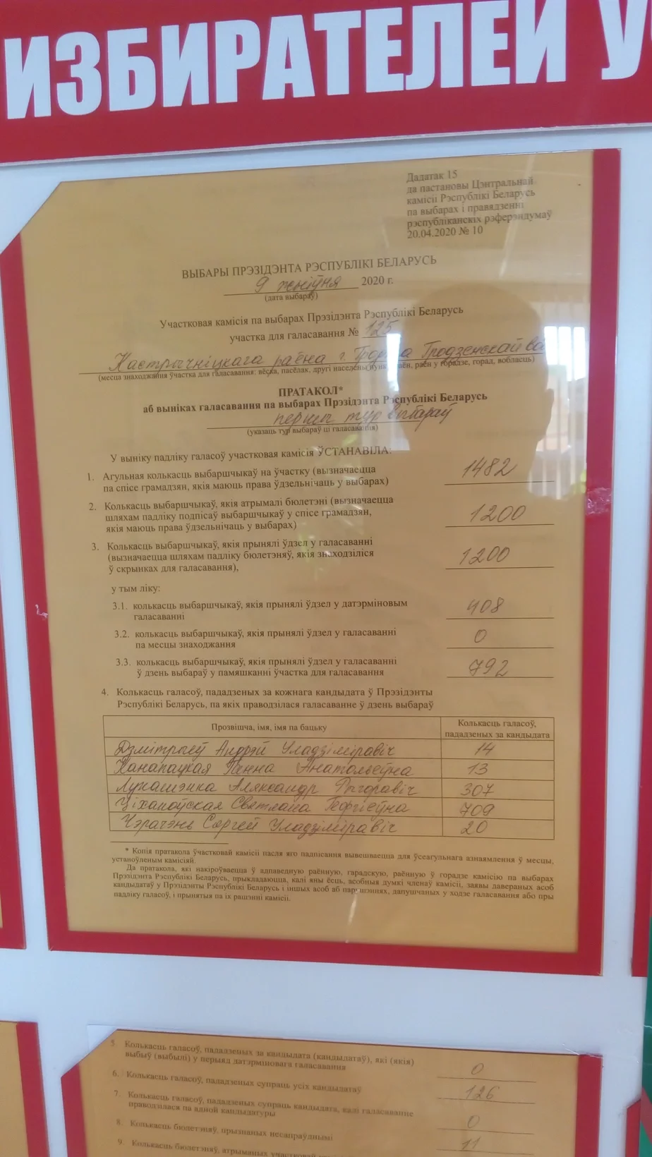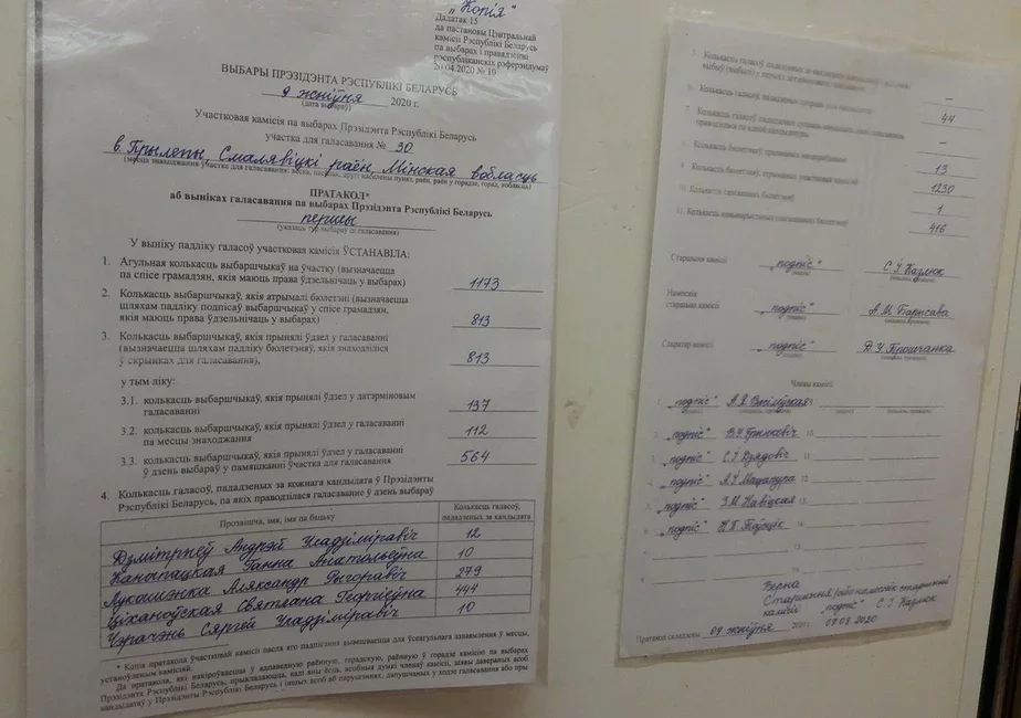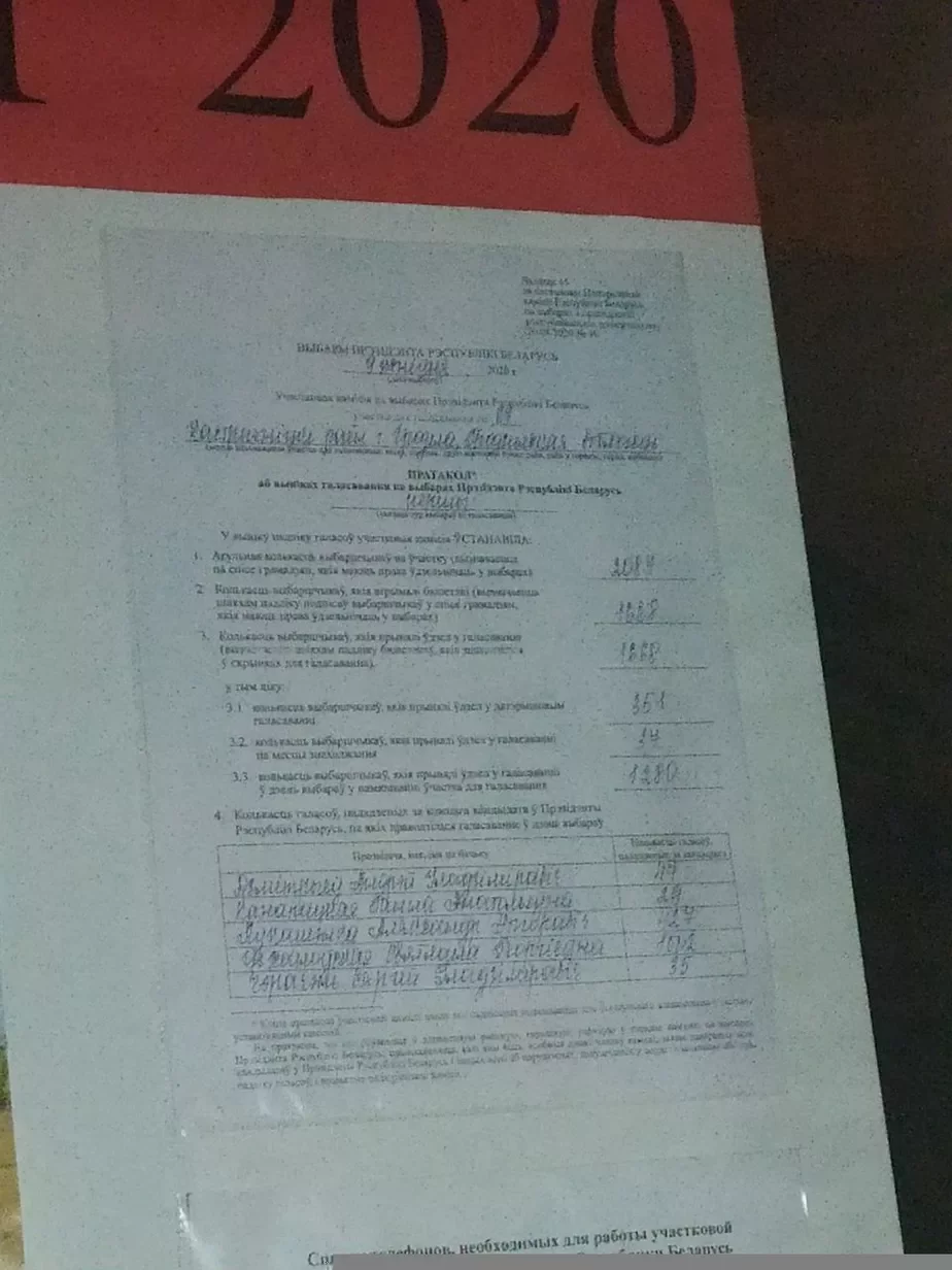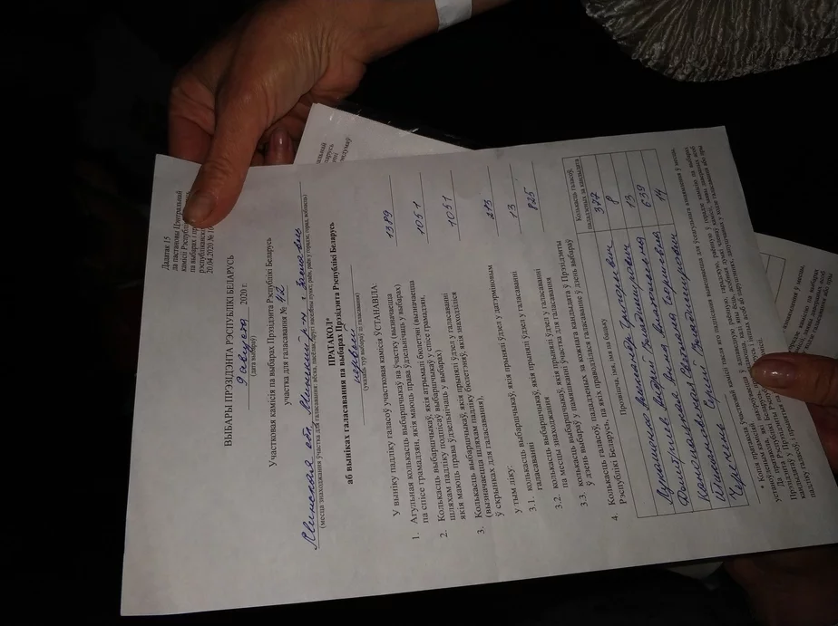 Але не ўсюды пратаколы былі вывешаныя, некаторыя выбарчыя камісіі пад наглядам сілавікоў «эвакуявалі» далей ад выбаршчыкаў, якія патрабавалі агучыць вынікі. А ЦВК абвясціў пра чарговую перамогу Аляксандра Лукашэнкі.