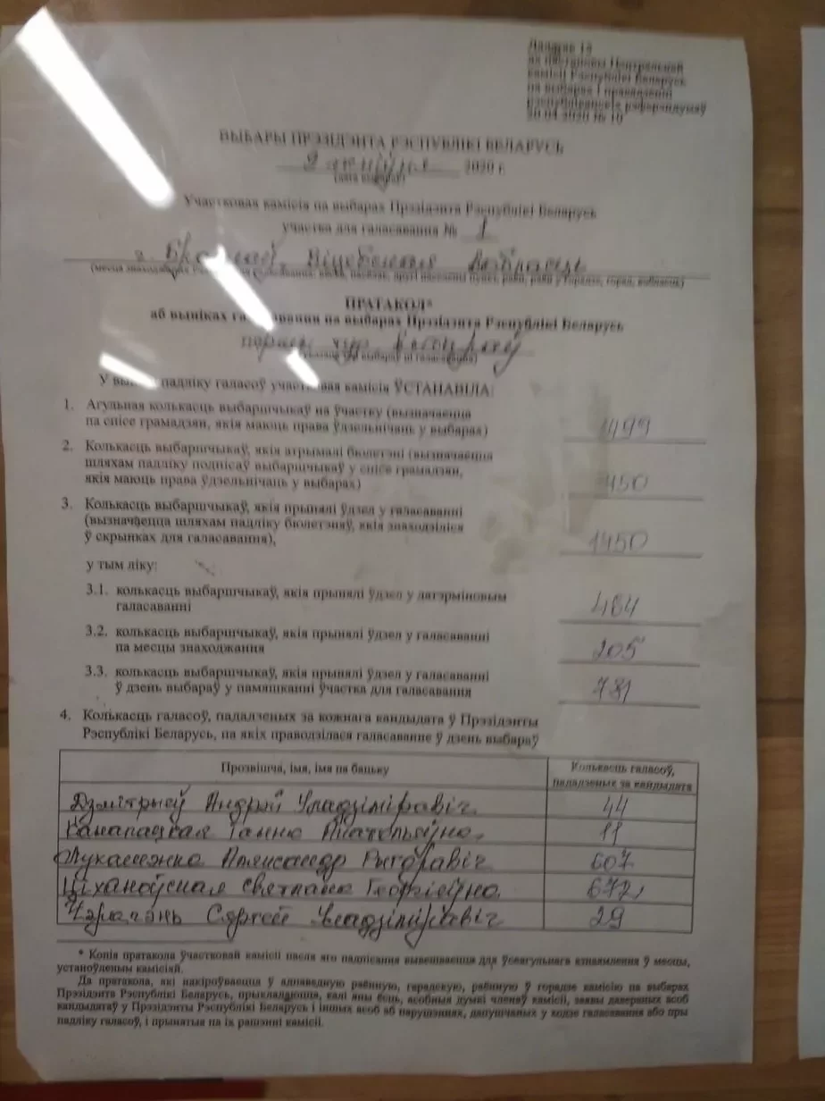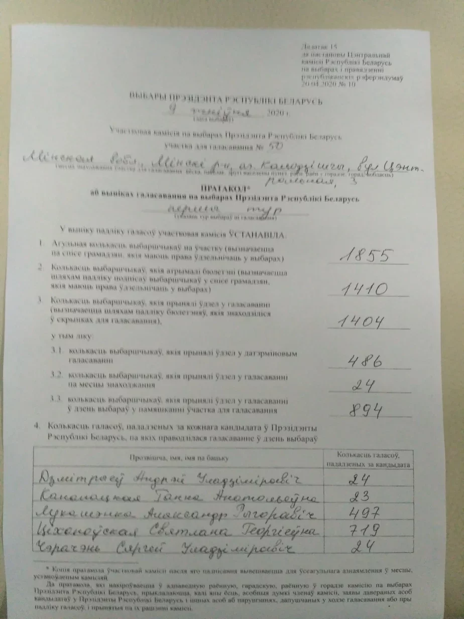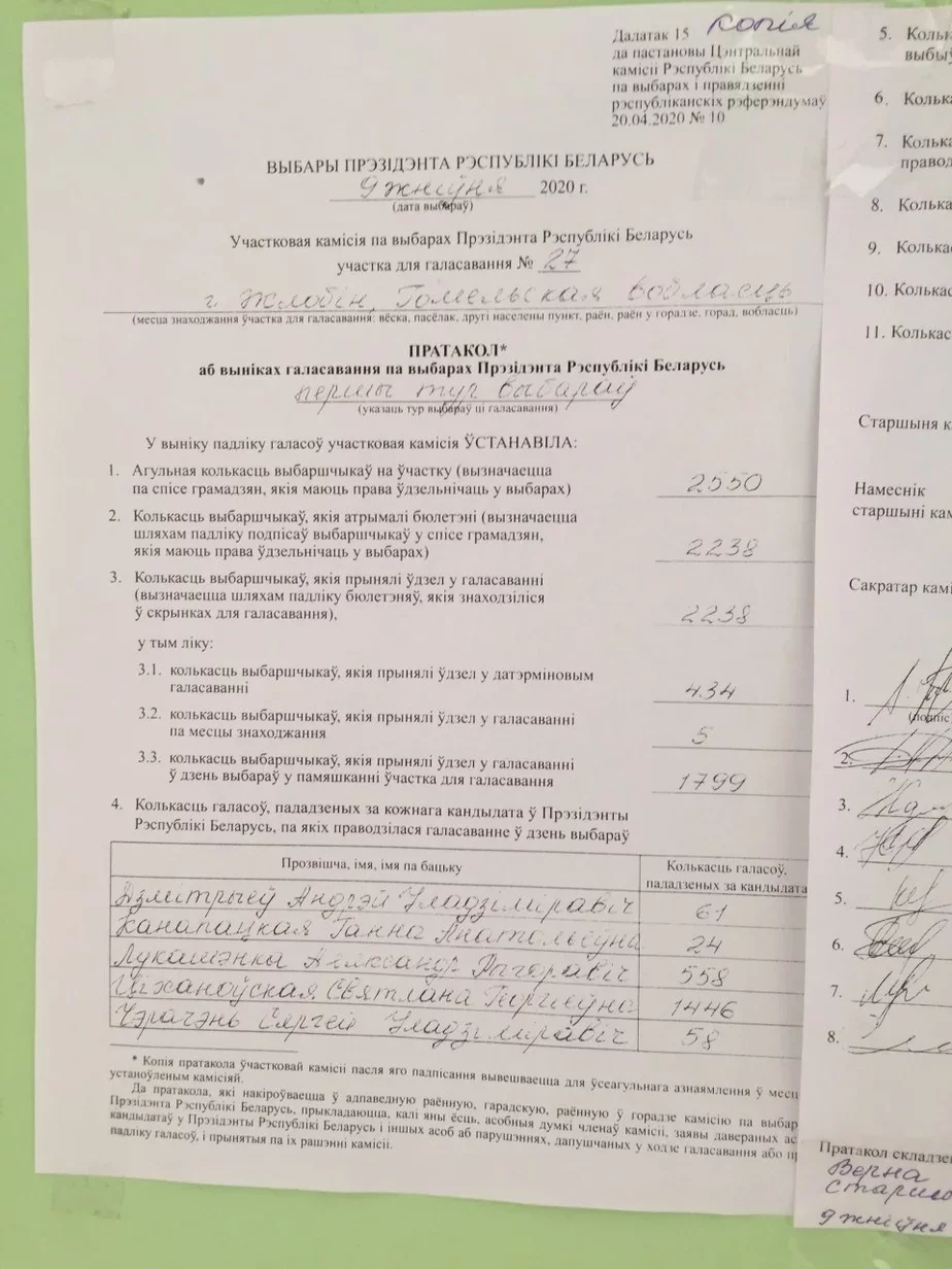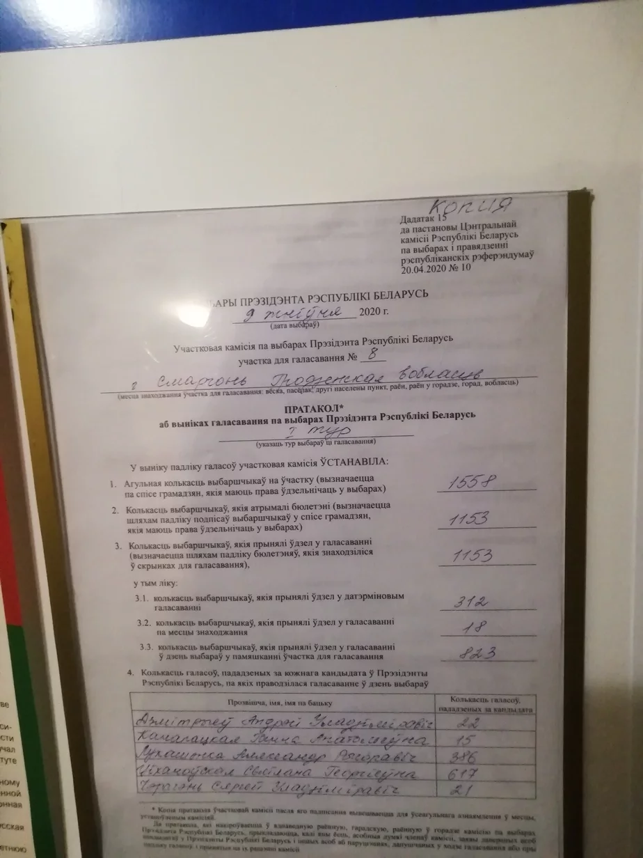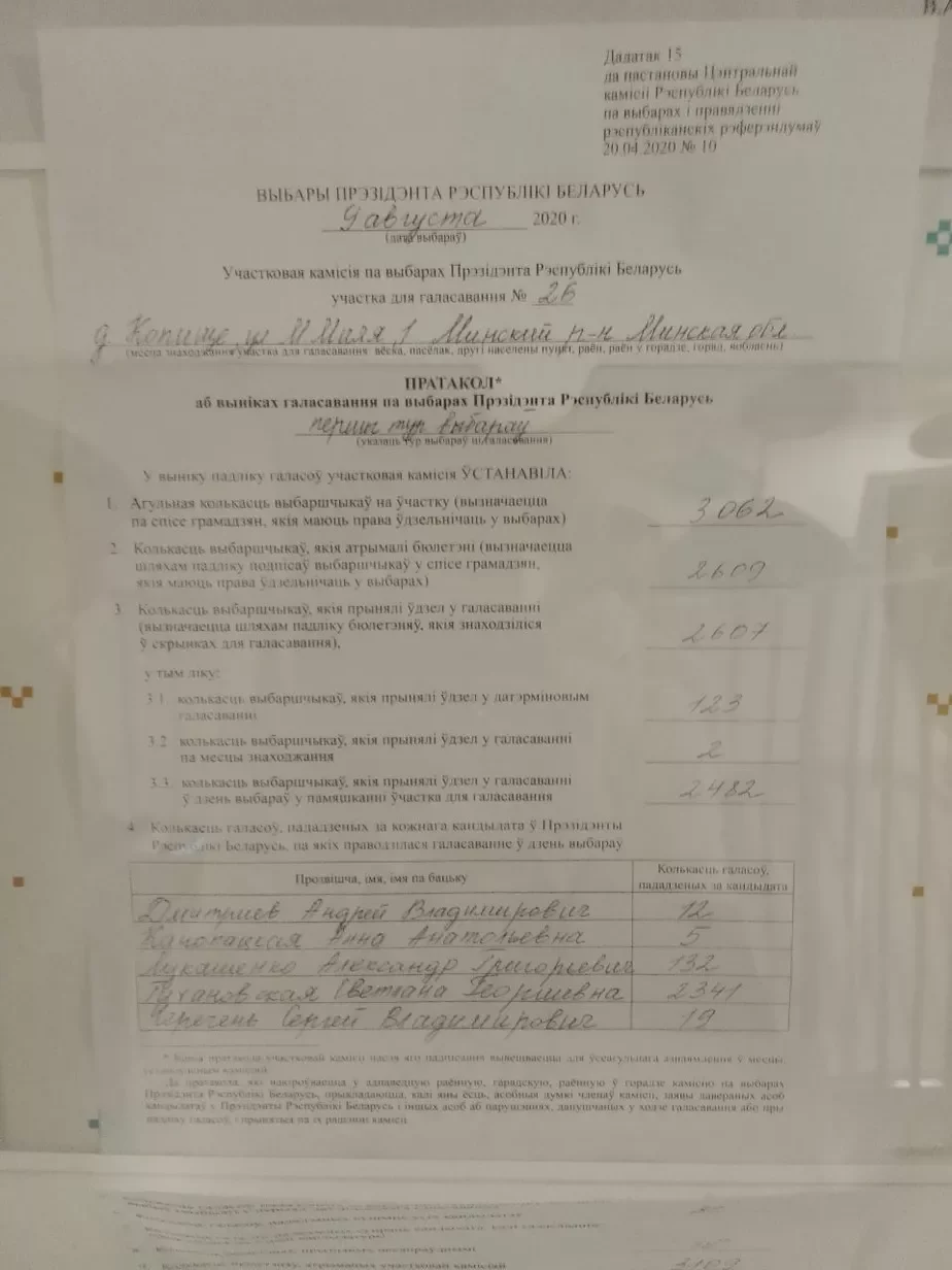 Але не ўсюды пратаколы былі вывешаныя, некаторыя выбарчыя камісіі пад наглядам сілавікоў «эвакуявалі» далей ад выбаршчыкаў, якія патрабавалі агучыць вынікі. А ЦВК абвясціў пра чарговую перамогу Аляксандра Лукашэнкі.