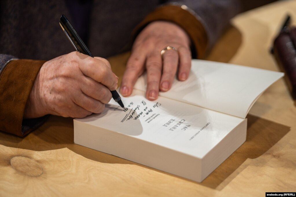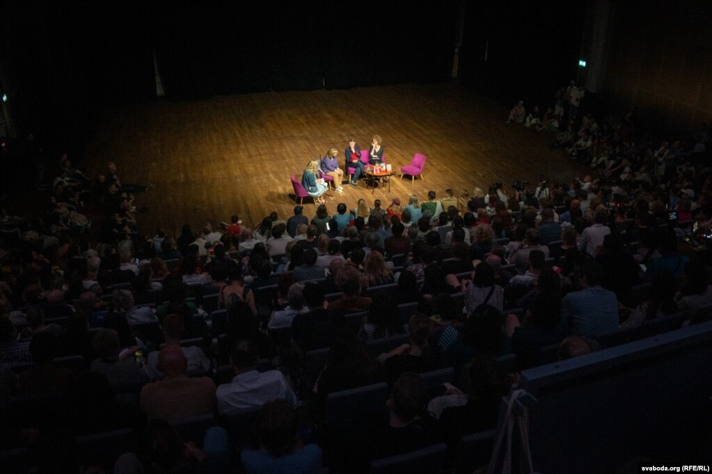 Я ня ведаю, калі вярнуся дадому, як і многія з вас. А яшчэ хачу выказаць сваё зьдзіўленьне і радасьць ад таго, што ў залі на сустрэчы зь пісьменьнікам можа быць так шмат людзей, якія вераць у слова, яшчэ вераць у сілу слова!» — Сьвятлана Алексіевіч не хавае эмоцыяў.