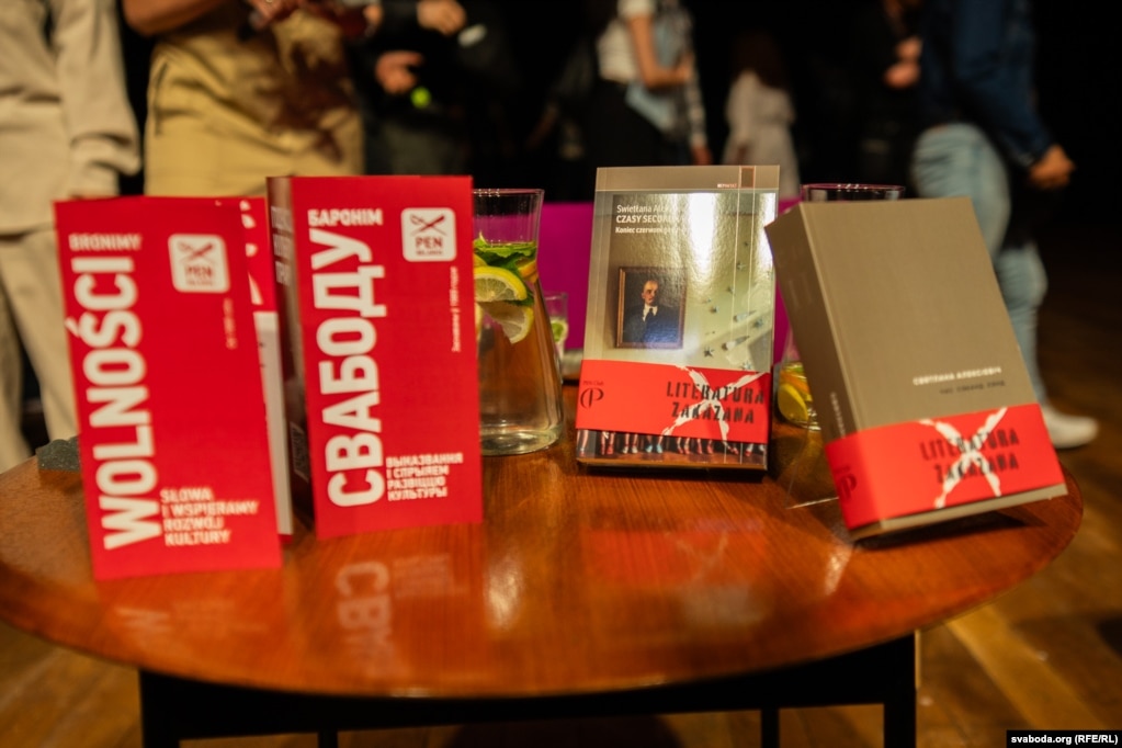 Мадэратарка Юстына Чахоўская расказала, што польскі ПЭН пачаў акцыю «Забароненая літаратура», хоць Польшча даўно ўжо забылася, што такое цэнзура. Сабралі кнігі, забароненыя ў розных краінах сьвету, — атрымалася каля 300 пазыцыяў. І, вядома, у першых шэрагах — кнігі нобэлеўскай ляўрэаткі Сьвятланы Алексіевіч, якія ўлады Беларусі сканфіскавалі зь бібліятэк і кнігарняў і прызналі «экстрэмісцкімі».