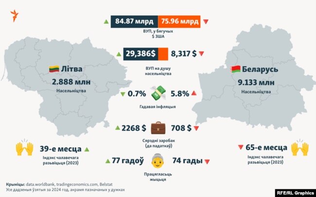 Зь інфаграфікі бачна, што Беларусь істотна саступае Літве паводле шэрагу сацыяльна-эканамічных паказьнікаў.